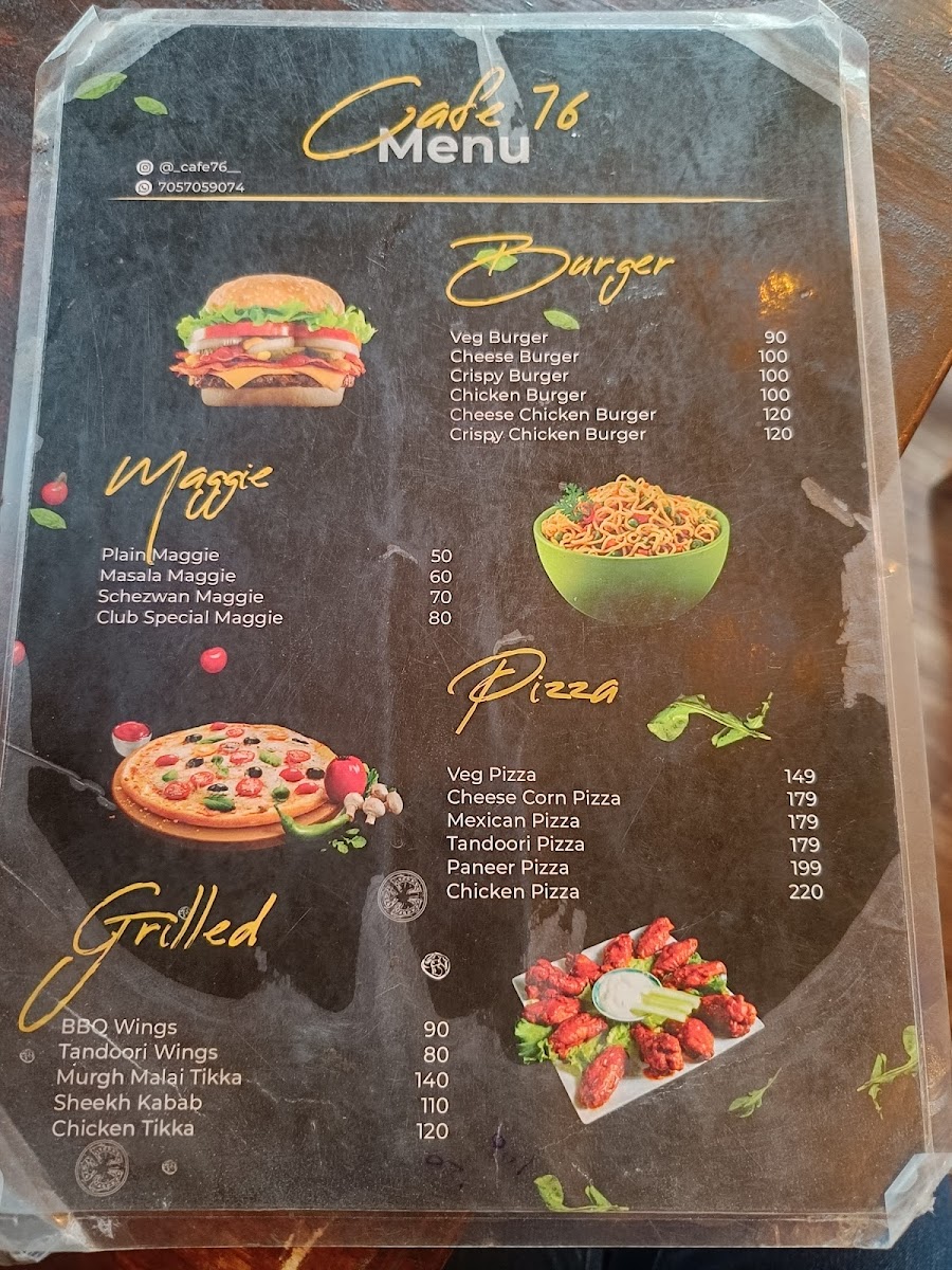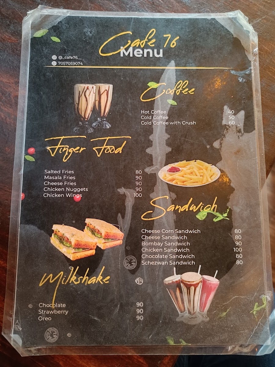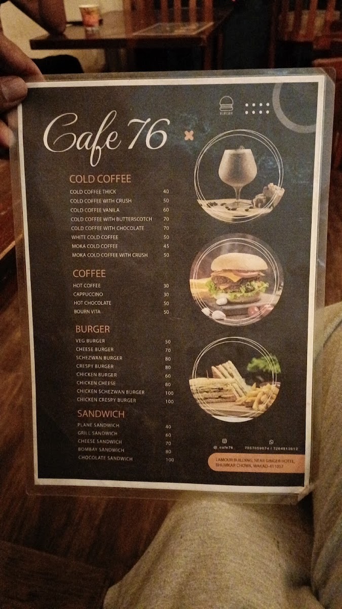 Introducing the menu at Cafe 76, a delightful haven nestled in Bhumkar Chowk, Tathawade, Maharashtra. This cafe is renowned for its diverse selection of mouthwatering dishes, making it the perfect spot for food lovers of all ages. Whether you crave a classic Veg Burger or an indulgent Chicken Schezwan Burger, there's something for every palate. Their sandwich offerings are equally enticing, featuring the signature Bombay Sandwich and unique Chocolate Sandwich for those with a sweet tooth.